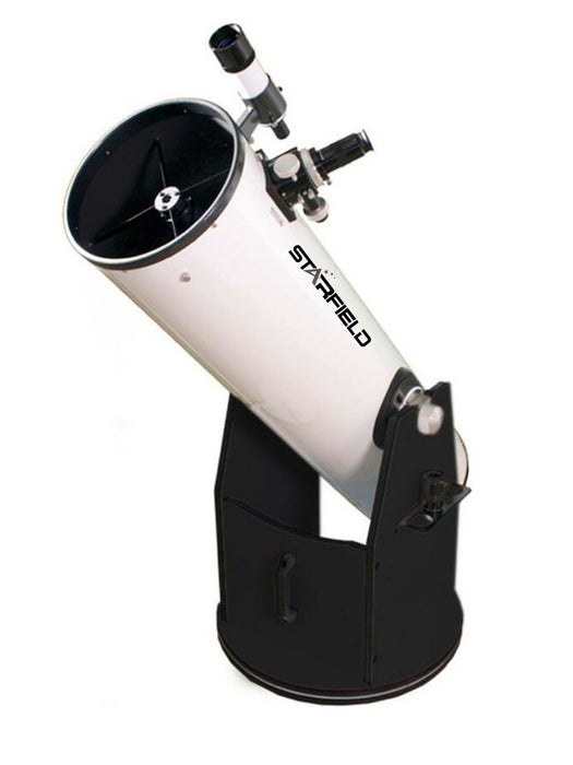12" f/5, 1520mm de longueur focale avec un focuser de style crayford rapide de 2", oculaires plossl de 30mm et 9mm, chercheur RA de 50mm. Ventilateur de refroidissement monté à l'arrière sur la cellule du miroir, et grands boutons de réglage.